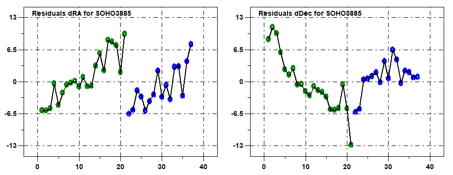 The residuals post conjunction are now as good as the residuals before conjunction and both show no trends. This leads to the conclusion that SOHO-3885 is not one but two comets.We have then not four but five fragments in 2019 (as in 2025). This result is confirmed by successfully linking the two parts of SOHO-3885 with the two fragments of 2025 August 21/22 and SOHO-2712 in 2014. These solutions differ by only 0.04 hours in their times of perihelion. The two fragments moved with 70 .. 80 pixel/hour through the SOHO LASCO C2 field of view. So they were separated by about three pixels. Both fragments appear stellar, not elongated and with no companion.