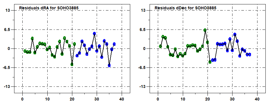 So only the first fragment was visible before solar conjunction and the second fragment was only visible after solar conjunction. This reminds me on the Marsden group comet pair SOHO-413/414, which was observed also in LASCO C2. The first fragment was visible on 1999 August 15 from 00:06 - 05:30 UTC and the second fragment was visible from 05:30 - 14:06 UTC. In the image from 05:30 they were separated by 67 pixels, their perihelia were separated by 1,2 hours. Compared to the two fragments of SOHO-3885 the separation of SOHO-413 and -414 was much greater and it was immediately clear that these are separate fragments. But as with SOHO-3885 the second fragment was visible after the first fragment had disappeared..